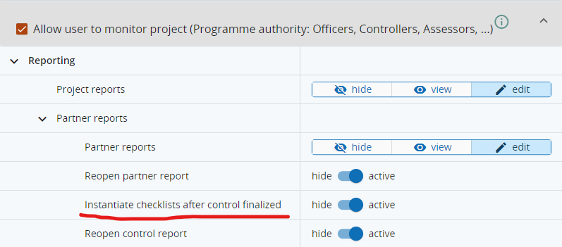 a programme user/controller with active system privilege “Instantiate checklist after control finalized“ can still create, fill in, download and finalize checklists - same rules as above apply for newly created checklists