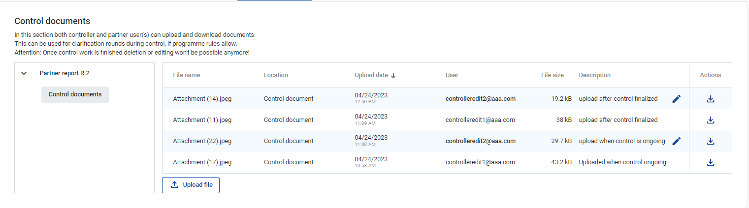 This section is quite unique in terms of privileges, as it is a shared file section, accessible to both controller(s) belonging to the control institutions assigned to a partner and also partner user(s) (assigned via Project privileges). This section can be used to upload and download documents related to the control report.