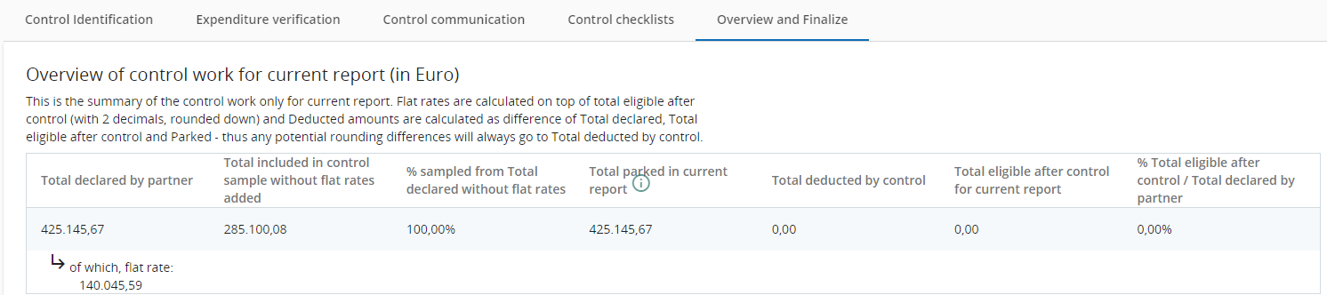 Total eligible after control - is summing up the certified amount in EUR of the expenditure items from Expenditure verification tab. Flat rates are added on top and calculated according to the partner budget rounding settings (2 decimals, rounded down)