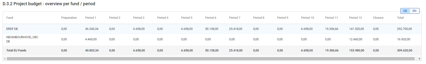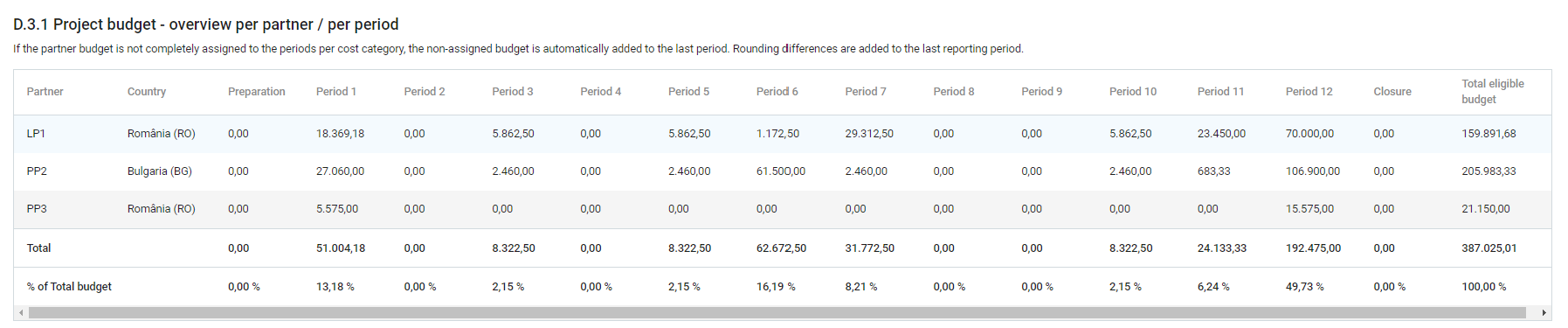This table indicates the budget per partner per period. If the partner budget is not completely assigned to the periods per cost category, the non-assigned budget is automatically added to the last period. Rounding differences are added to the last reporting period.