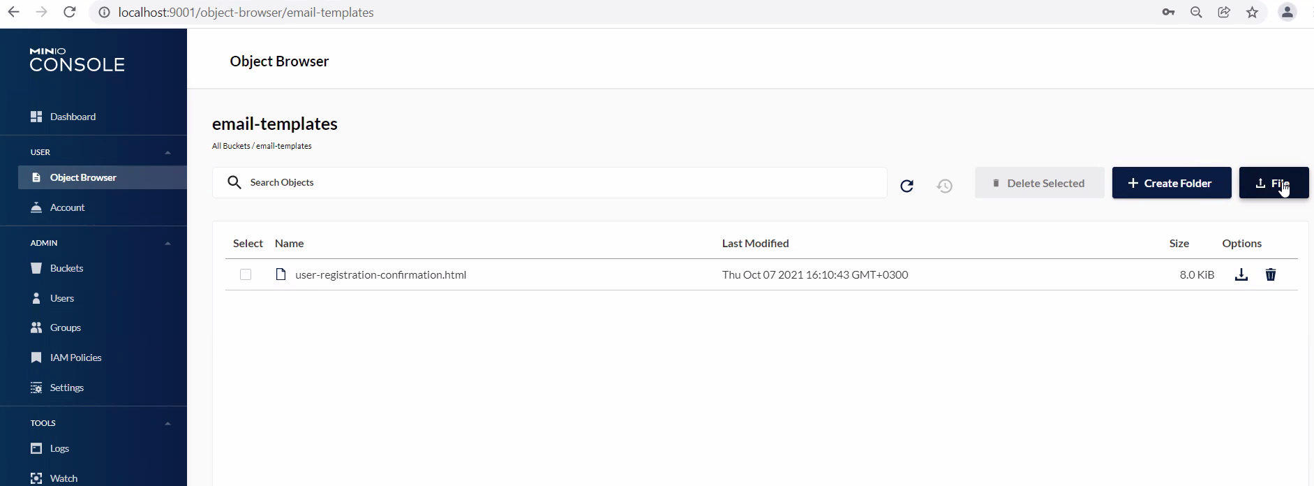 The upload of the template must have exact name (e.g. “user-registration-confirmation.html“) and corresponding standard templates shall be found in the release package, folder /resources. The following picture shows the file uploaded to the right bucket with exact filename required:
