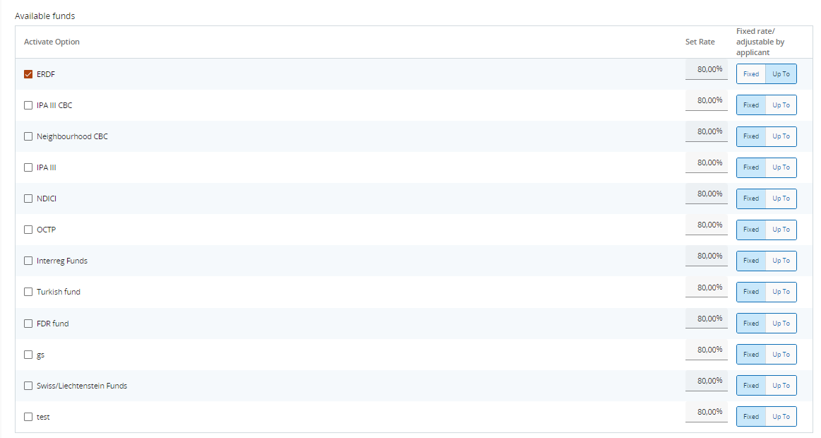 Additionally if a fund is chosen one can define the co-financing rate up to two decimals and choose if the co-financing rate is Fixed or Up To. Fixed means that the co-financing rate cannot be changed by the applicant. Up To means that the applicant can still lower the co-financing rate defined by the programme (e.g. in case of state aid or other mitigating schemes).