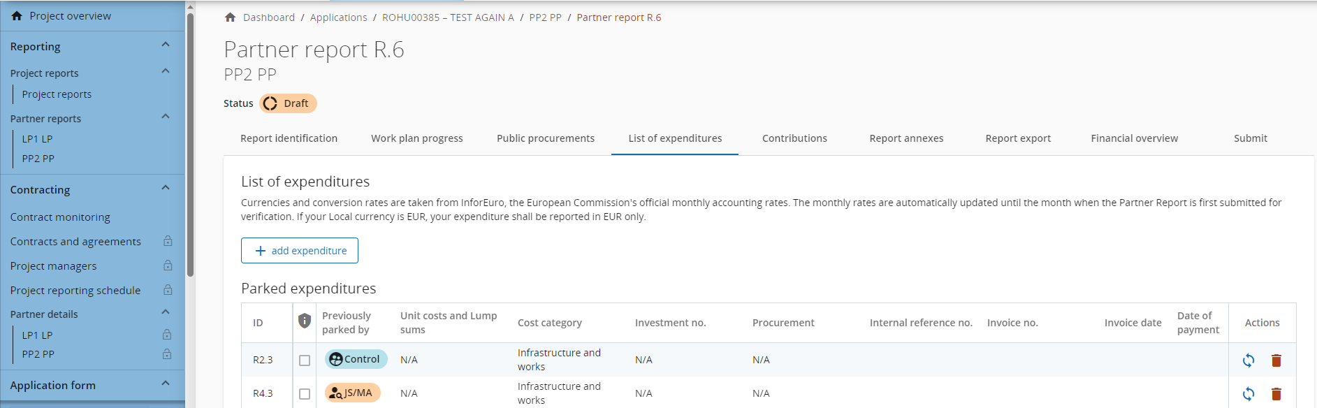 In case a controller/programme user parked some items in control/verification of project report, they show up in the Parked expenditure section in the List of expenditure.