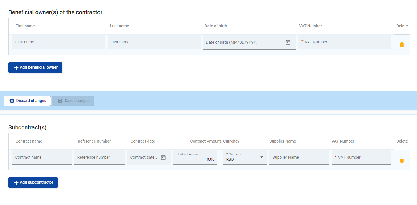Beneficial owner(s) and subcontractors can be added in any draft partner report after procurement was created, but items added in previously submitted partner reports are locked for editing/deletion.