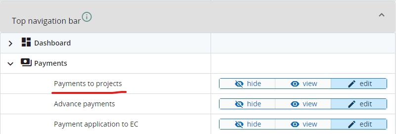 Users with system privilege Payments to projects have access to top bar navigation Payments menu and can navigate to Payments to projects.