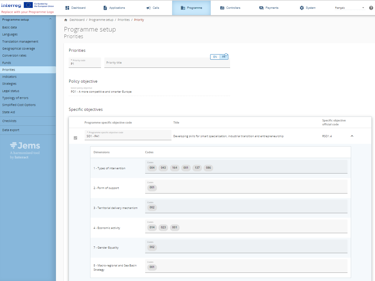 The Policy Objectives and Specific Objectives available in Jems to be selected for Programme Priorities follow the structure of the Regulations and SFC.