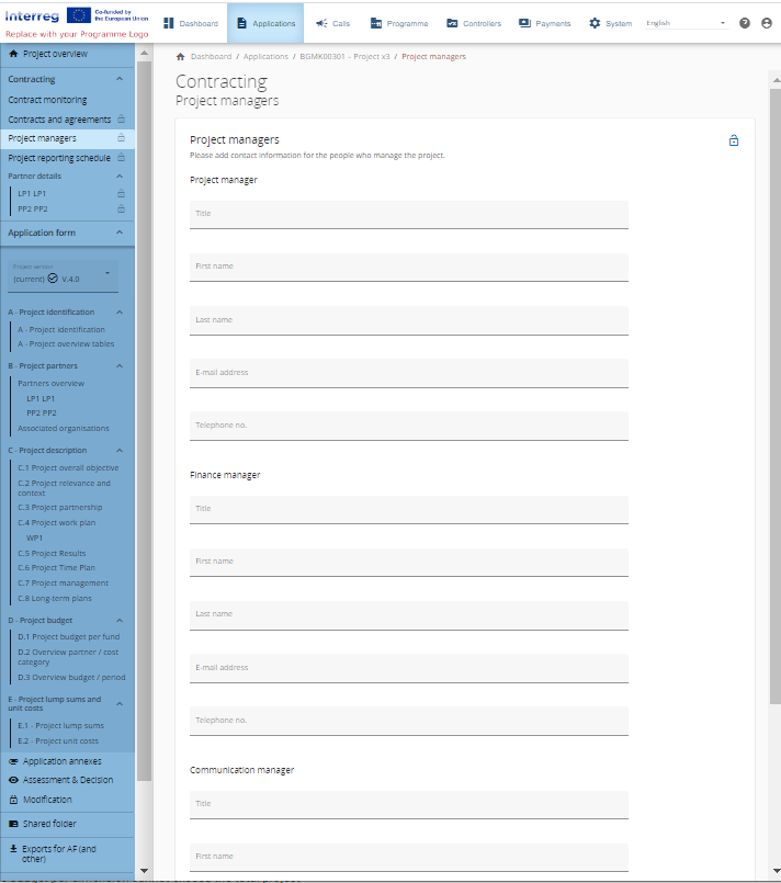 The Application Form users / Project managers with edit or manage rights are allowed to complete this section. Partner users have view rights.