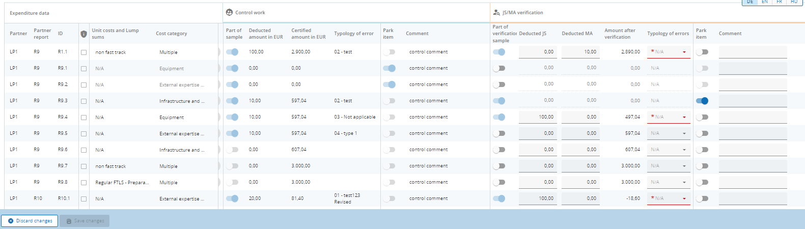 For each item, user can scroll to see info as included in initial partner report, results of control work and finally columns relevant for JS/MA verification that can be filled in for each item.