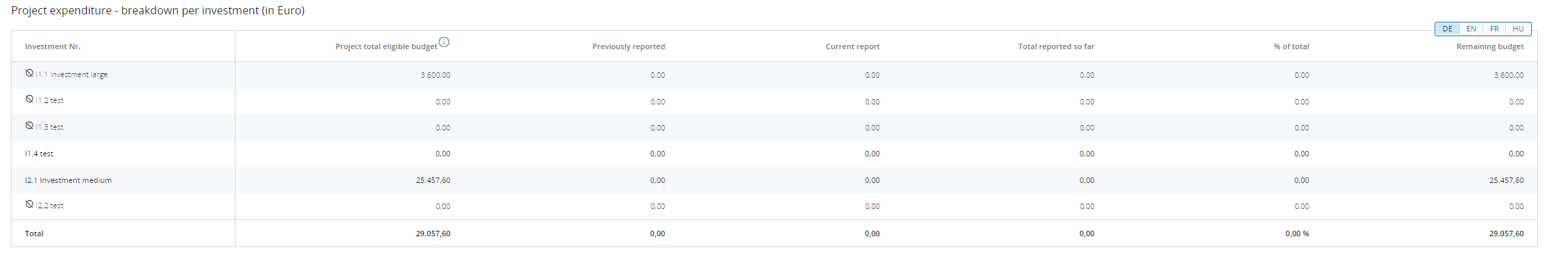 What is important to note is what is described in the info bubble: no Simplified cost items are added up to this table, as they are automatically calculated on top. Only real costs linked to the investment in the List of expenditure are displayed in this overview table.