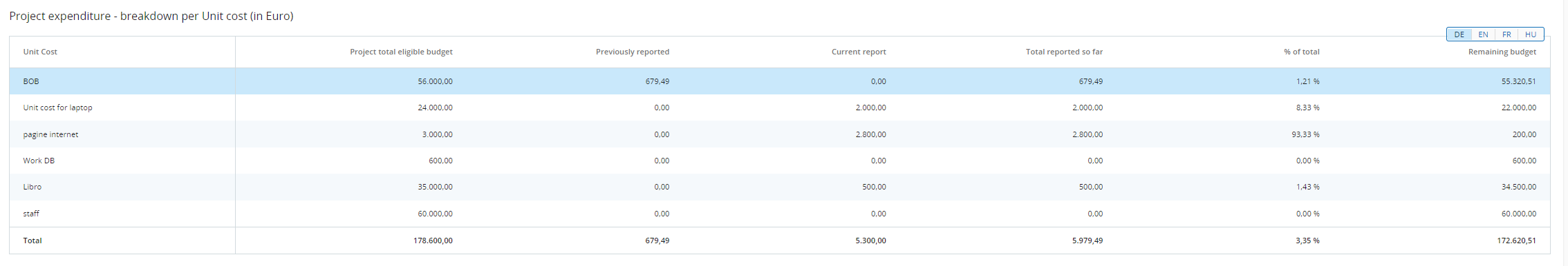 Similar as the lump sum overview table, this table lists all unit costs approved in Application and reported by the project.