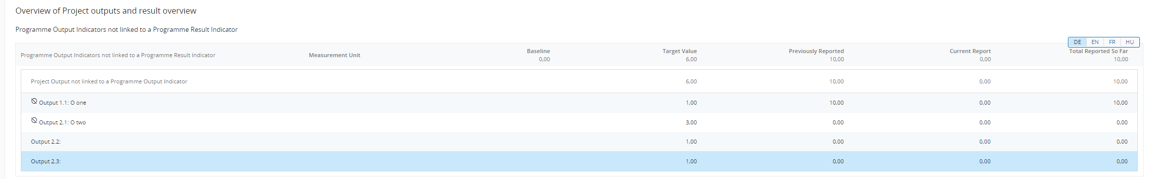 There is an overview of Output and result indicators. If in the programme setup Output indicators are linked to Result indicators, they are shown in one table in this section. If they are not linked, the Output and Result indicators are listed seperately. Values are cumulative. Whenever a report is submitted and a new report is created the values from the previously submitted report are added to the previously reported column.