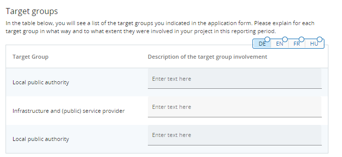 In case section C2.4 is switched on in the Application form configurator and is also completed in the application form, the following table shall show up. Project managers are requested to describe the target group involvement during the indicated reporting period.