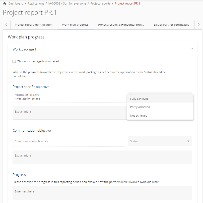 The progress made on the Project specific objective and the Communication objective is to be described and there is a field to select the Status of the objectives. The project manager can select, if the objectives have been “Fully achieved”, “Partly achieved” or “Not achieved”. Further, there is a textbox to describe the overall progress in the work package.