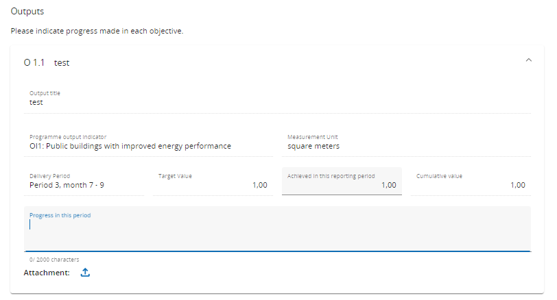 For each Investment, Activity, Deliverable and Output there is a separate section with text fields to describe the progress in the reporting period. Similar as for objectives, for each activity there is a field to define the Status.