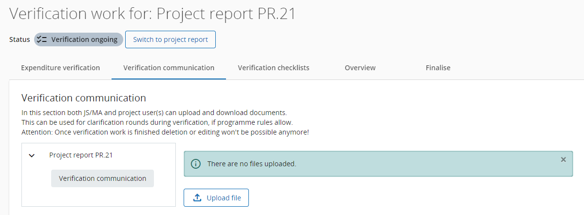 This section is quite unique in terms of privileges, as it is a shared file section, accessible to both programme users assigned to project and also partner user(s) (assigned via Project privileges). This section can be used to upload and download documents related to the verification of the project report.