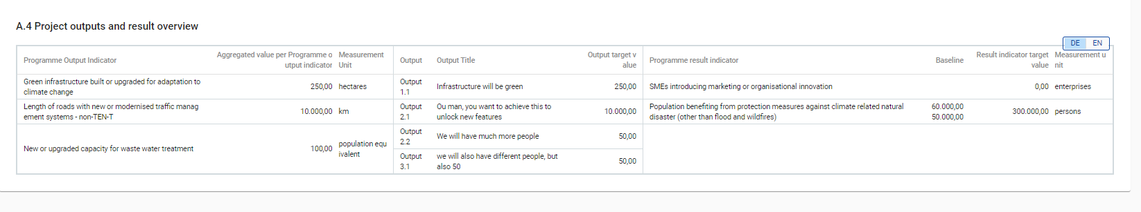 In the programme setup, programmes can link Output indicators to result indicators. This overview table shows the link between output and results in the Application Form. The outputs of a project lead to certain results and this is what this table aims to show.