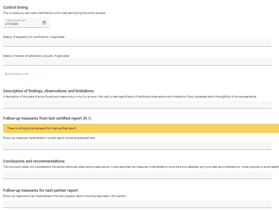 The text filled in the field Follow-up measures for next partner report of a finalized control report is displayed for information purposes in the next control report in section Follow-up measures from last certified report (on yellow background).