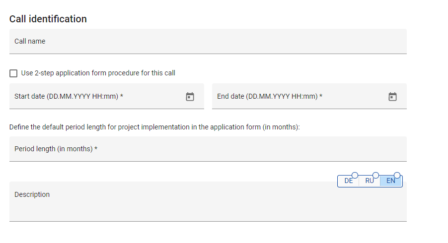 The call identification includes general parameters like call name and call description (in all system languages) as well as the start and end date of the call. Also, the default period length can be defined.