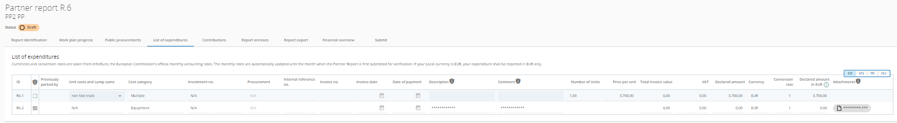 This running number is always in the format R[report number].X. The ID is dynamic in draft status (reports created have seamless consecutive numbering, even if a report is deleted), however it will be frozen upon submission of the report. The number will be used later on to identify cost items coming from another (previous) report (through parking of expenditure).